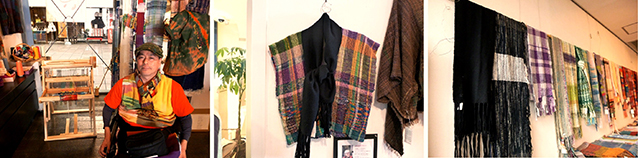 小林さんは介護タクシーを利用されてギャラリーに居られ話をお聞きしました。平成18年に被災され、頚髄損傷で車いすの生活をされていますが、別府重度障害者センターの職業訓練の中で「さをり織り」に出会われて以来約8年余りにわたって続けられておられ、「趣味と実益をかねています。」と笑いながら話されました。会場内には会員さんの作品が並び、小林さんの作品も数点展示・販売されていました。